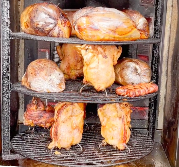 O outro fator – como quinta hipótese – é o tempero dos frangos e dos recheios. Alguns preparadores colocam o frango mergulhado em temperos por algumas horas, as vezes até por toda a noite. Não são temperos como aqueles dos assadores americanos de porco que se apresentam em competições com molhos secretos que geralmente incorporam pelo menos 50 iguarias! Porém cada assador tem a sua receita, geralmente associada, ao vinagre, ao sal, ao alho e a cebola. Encontrei a citação do tomilho, alecrim, coentro, a pimenta do reino – e para a minha surpresa – de curry e das pápricas doces e picantes.