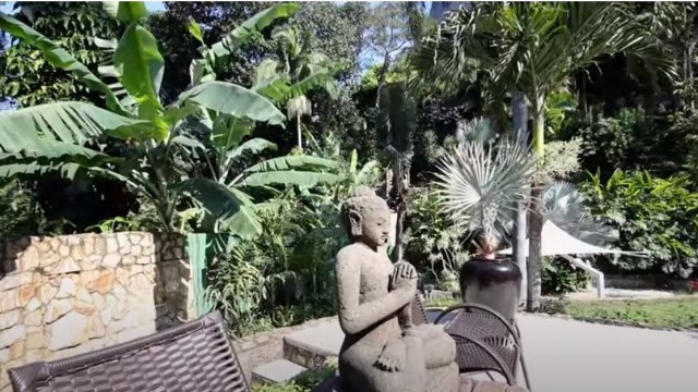 Uma área gourmet com churrasqueira, forno de pizza, canil, garagem também foi construído na área externa e conta com paisagismo ao redor da piscina, sauna à vapor e deck de meditação, onde está uma estátua de Buda.