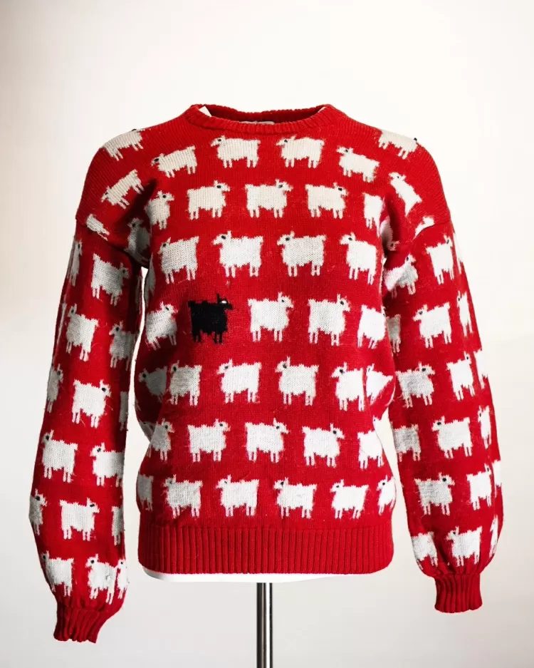 O suéter de lã estampado com uma única ovelha negra em meio a um padrão de brancas estava em exibição na casa de leilões Sothebys em Londres, nesta segunda-feira, 17.