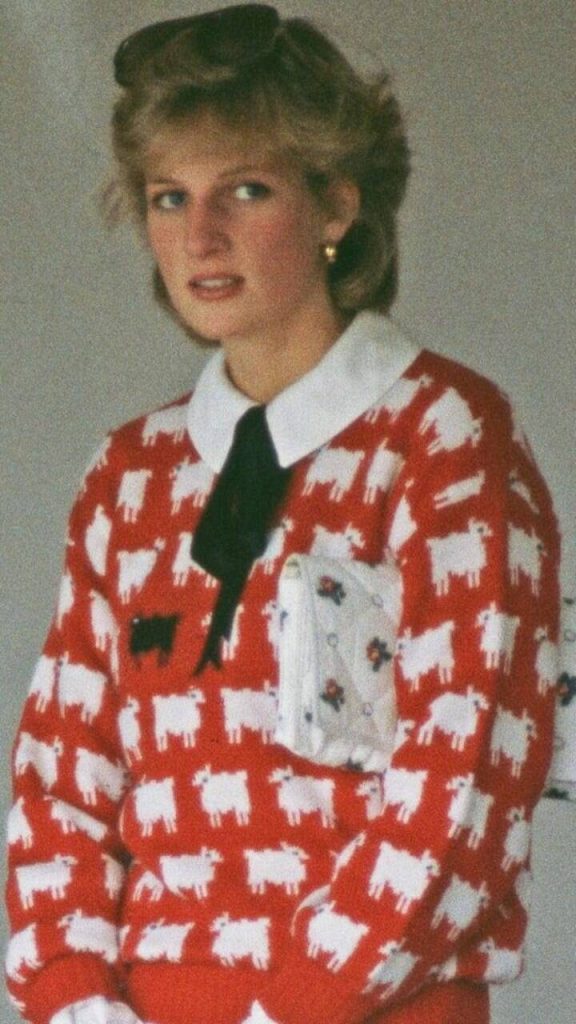 Diana já estava se tornando um ícone de estilo – e uma das mulheres mais fotografadas do mundo – e o momento deu um grande impulso às estilistas Sally Muir e Joanna Osborne, que fizeram o suéter para sua pequena marca de malhas Warm & Wonderful.
