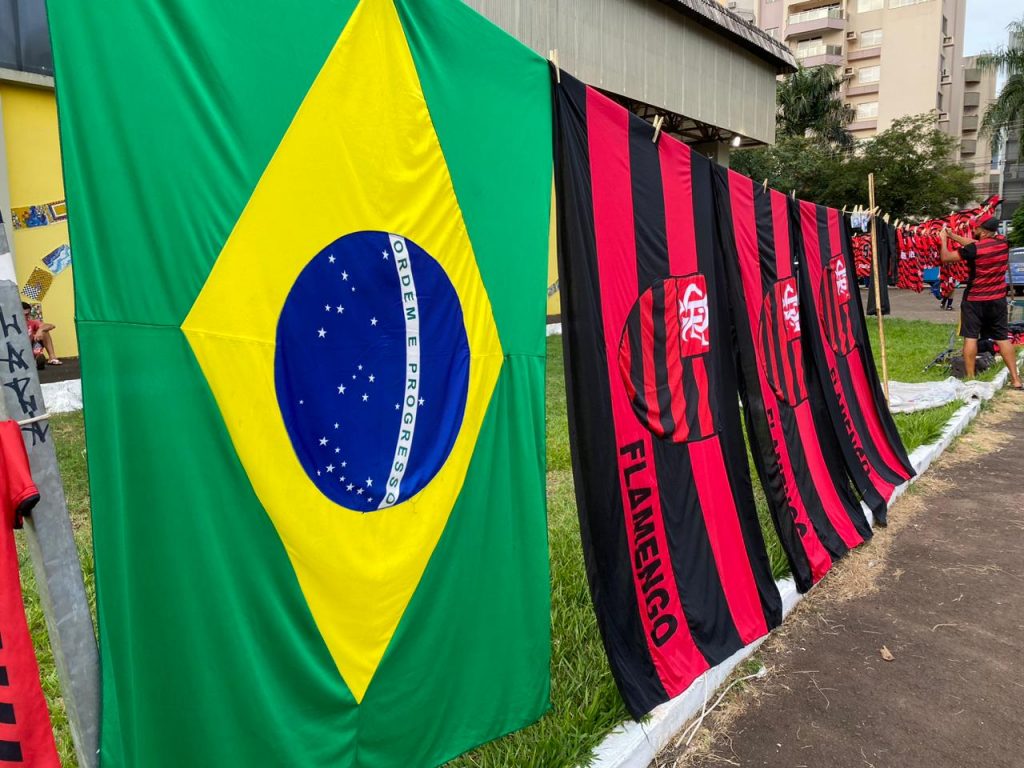E quem também comemora a partida entre Maringá FC e Flamengo é o vendedor ambulante José, que saiu de São Paulo (SP), para vender camisetas, bandeiras e bonecos dos times que se enfrentam nesta noite no estádio maringaense.
