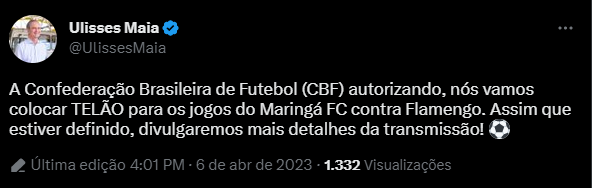 A Prefeitura de Maringá aguarda a liberação da Confederação Brasileira de Futebol (CBF) para colocar um telão para realizar a transmissão simultânea do jogo entre o Maringá Futebol Clube contra o Flamengo.