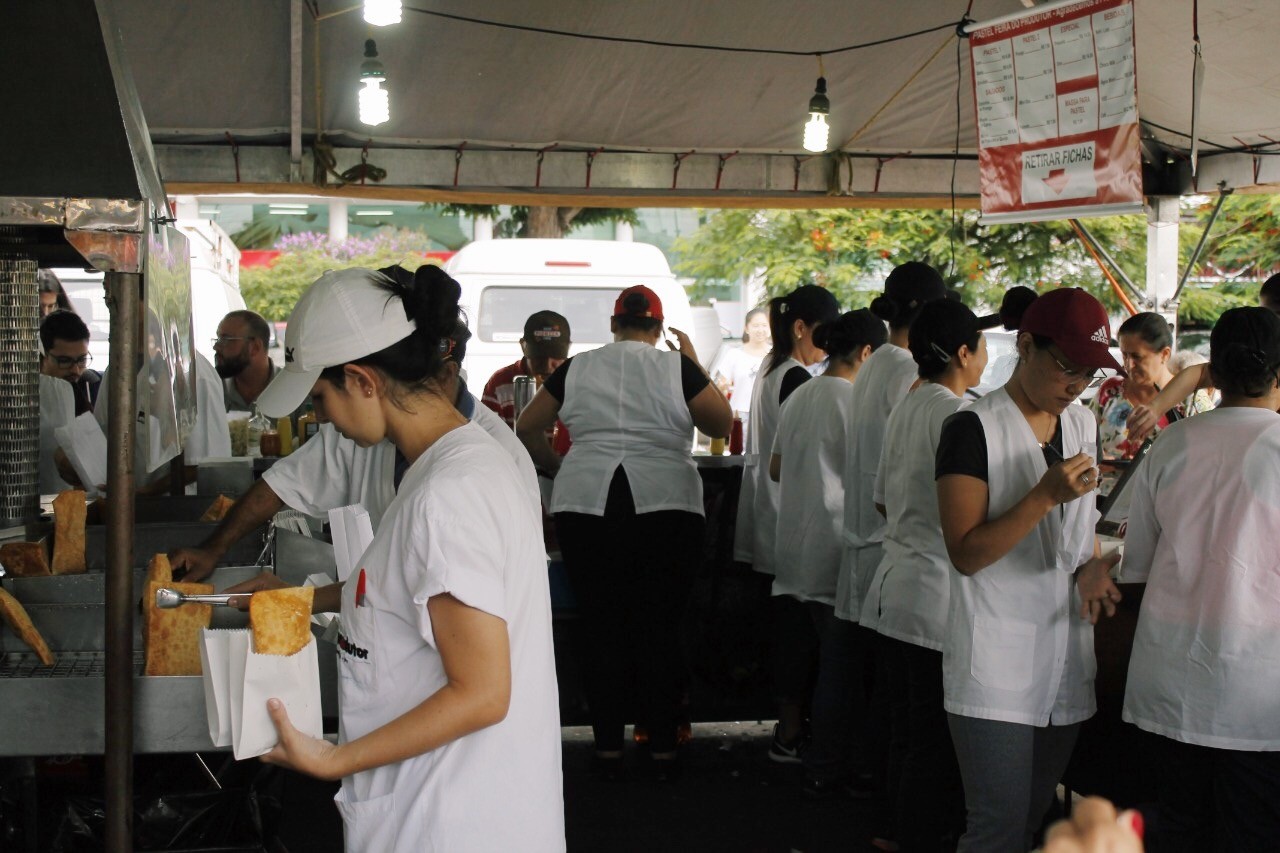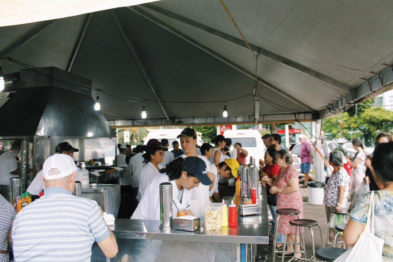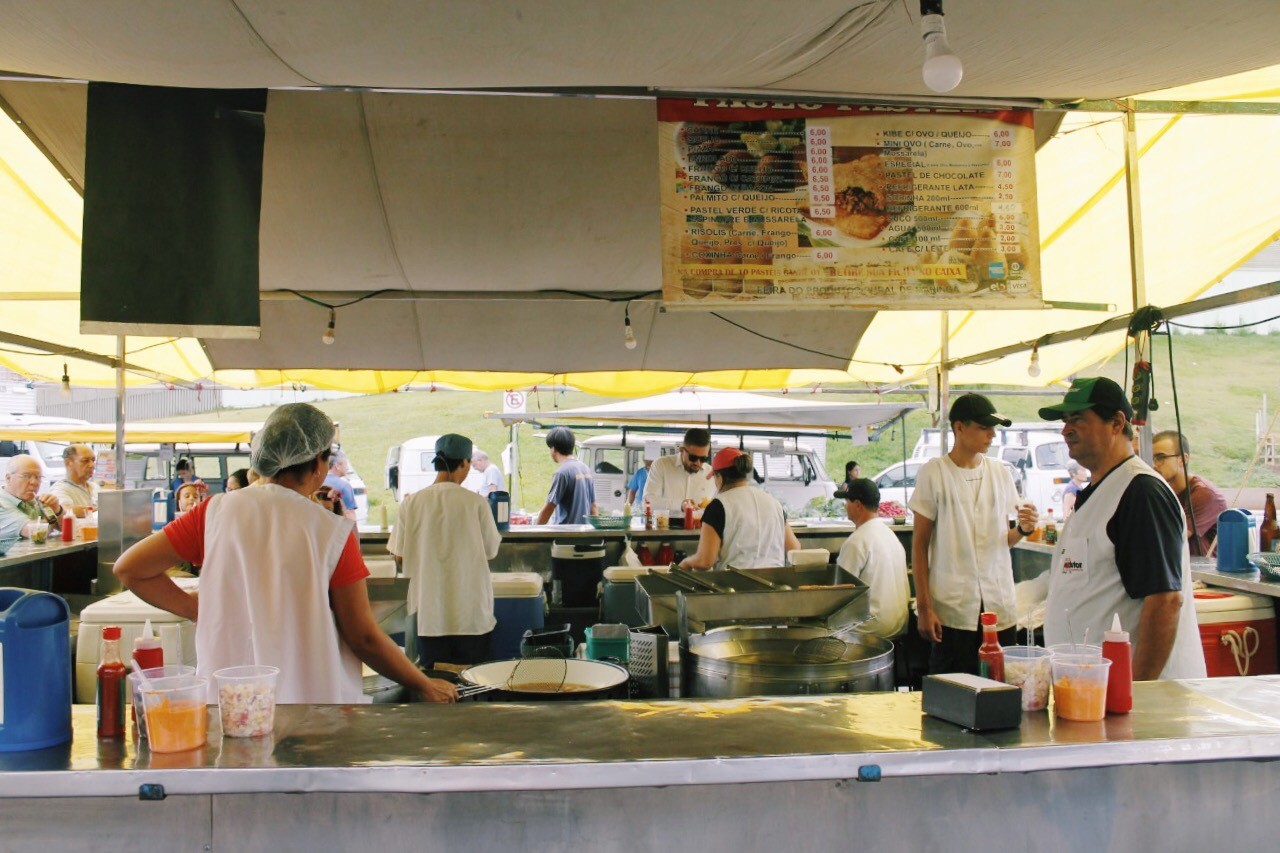 Yoshihiro Takahashi é sócio-proprietário da Cia do Pastel, barraca que está há quase 30 anos na Feira do Produtor. Na Cia do Pastel, 25 pessoas trabalham na produção dos salgados, que são montados e fritos na hora. E adivinhem: