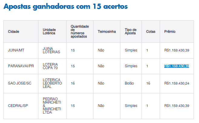 Além disso, as outras três apostas que acertaram as 15 dezenas são de Juína (MT), São José (SC) e Cedral (SP). Veja mais detalhes abaixo: