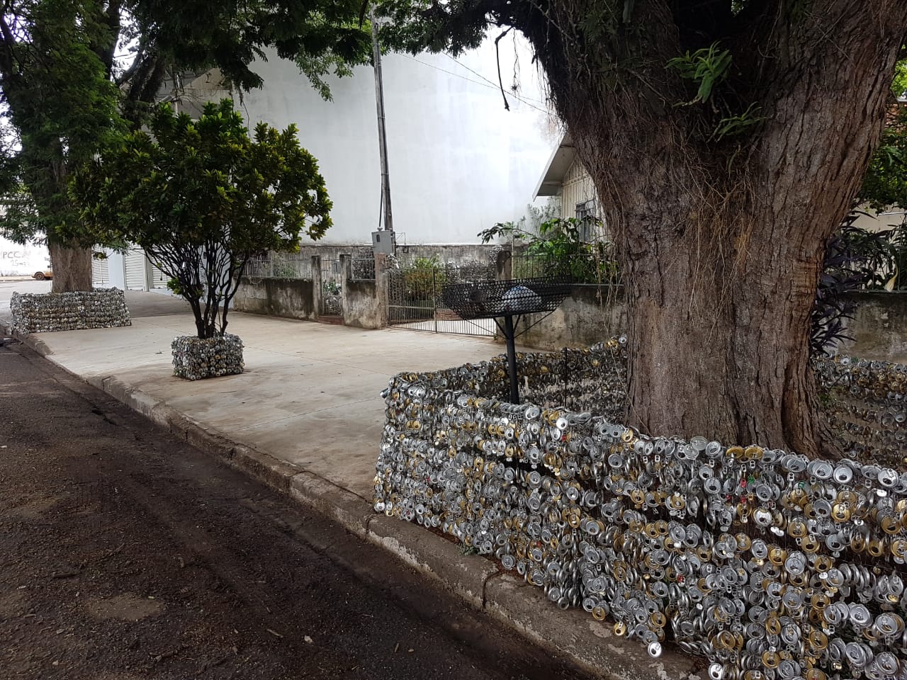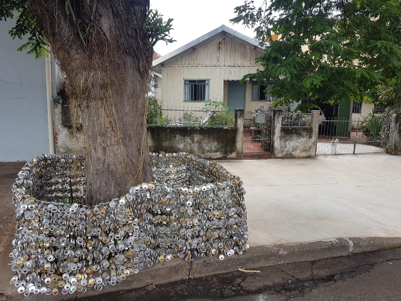 As latinhas de alumínio, incluindo os lacres, predominam na decoração, mas há também outros tipos de metais em meio às estruturas. Com a ajuda de um dos filhos, Gentil expandiu a obra para a calçada recentemente.
