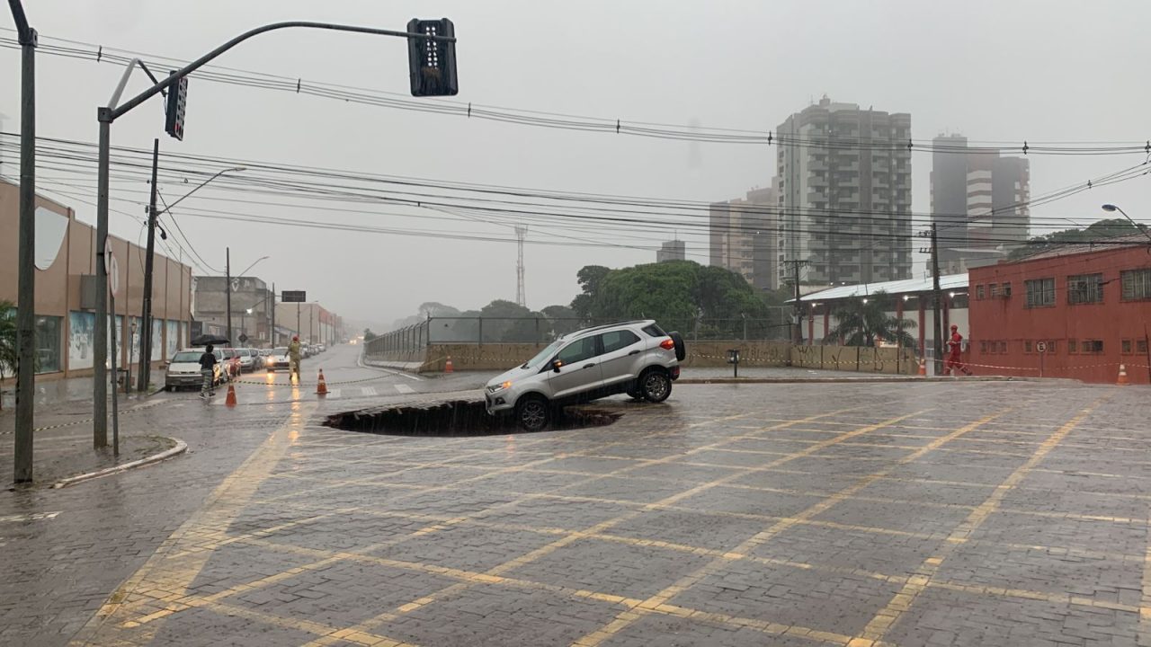 Cratera quase ‘engole’ carro no centro de Maringá; VEJA VÍDEOS