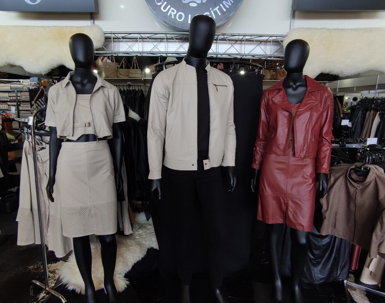 As peças vão muito além das tradicionais jaquetas. O estande oferece uma ampla variedade de modelos para o público feminino e masculino, com destaque para saias, vestidos, regatas, croppeds, blazers, calças e shorts, todos confeccionados com couro legítimo de alta qualidade. A matéria-prima é importada do Rio Grande do Sul, mas toda a produção acontece no Paraná.