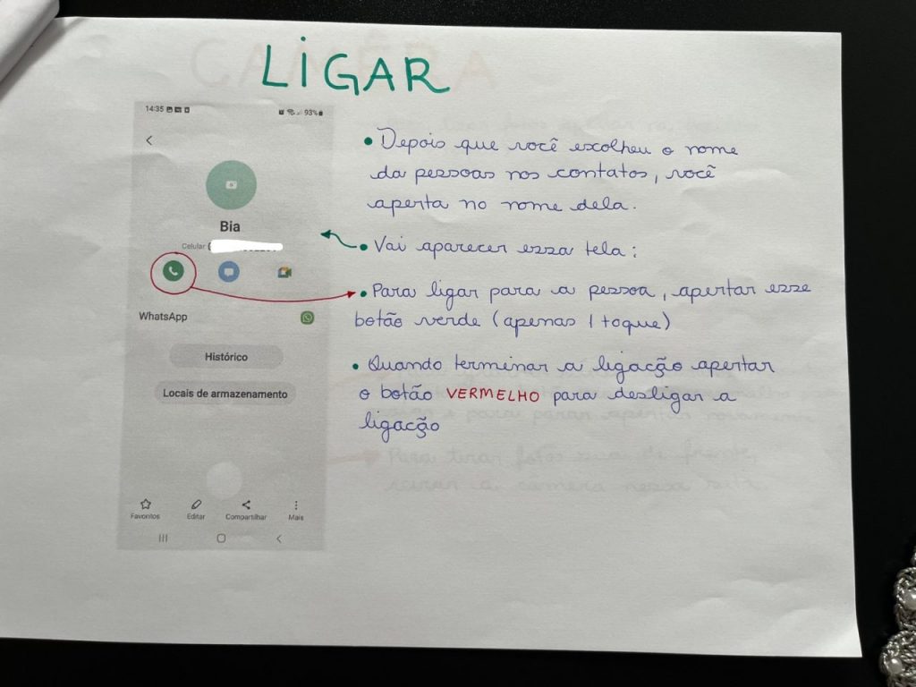 “Eu fiz um manual para ela, tirei print de todas as telas do celular que ela iria usar e detalhei tudo, coloquei a função de cada ícone. Foquei bastante no WhatsApp também, explicando cada coisinha que tinha e que ela poderia utilizar. No começo eu percebi q ela estava um pouquinho perdida ainda, mesmo com o manual, eu mandava mensagem para ela, ela nem visualizava, mas agora ela já consegue visualizar e até me responder em áudio, muito fofa!!”