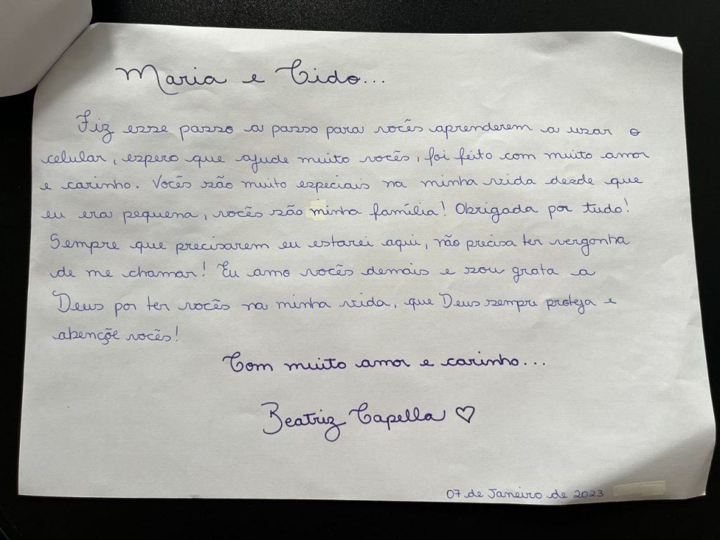 Isso porque, ela postou em em seu perfil no TikTok um vídeo que mostra ela ensinando a vizinha Maria, de 68 anos, a utilizar o celular pela primeira vez. A ideia de Beatriz foi fazer um tutorial escrito à mão, bem detalhado e colorido, para facilitar o entendimento para a Maria. O vídeo mostra que a idosa se surpreende quando descobre, por exemplo, a possibilidade de fazer uma chamada de vídeo, e se emociona ao ver pela câmera o filho que já não via há cinco anos. Beatriz encerra o tutorial com uma dedicatória para a vizinha – veja abaixo o tutorial criado pela jovem.