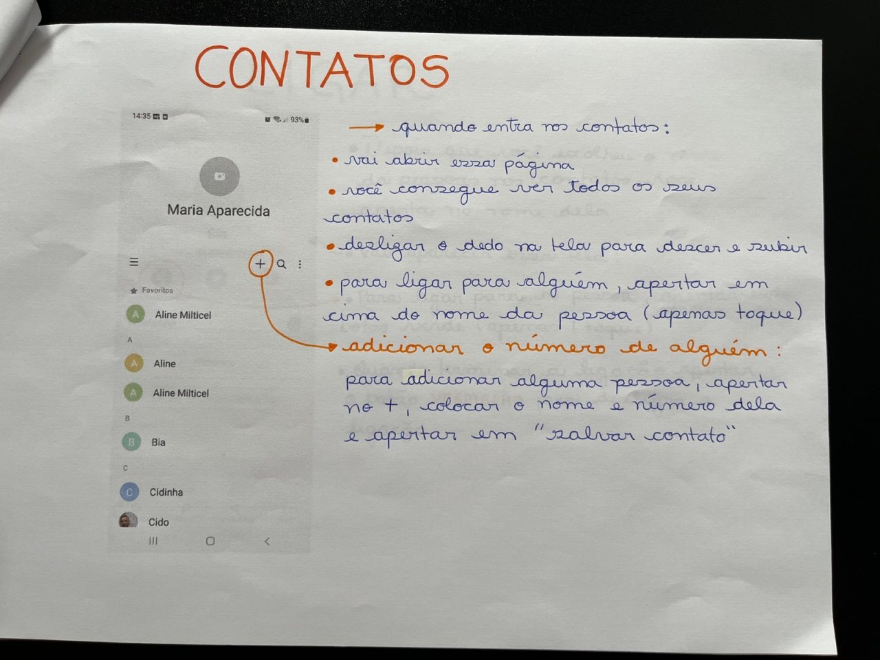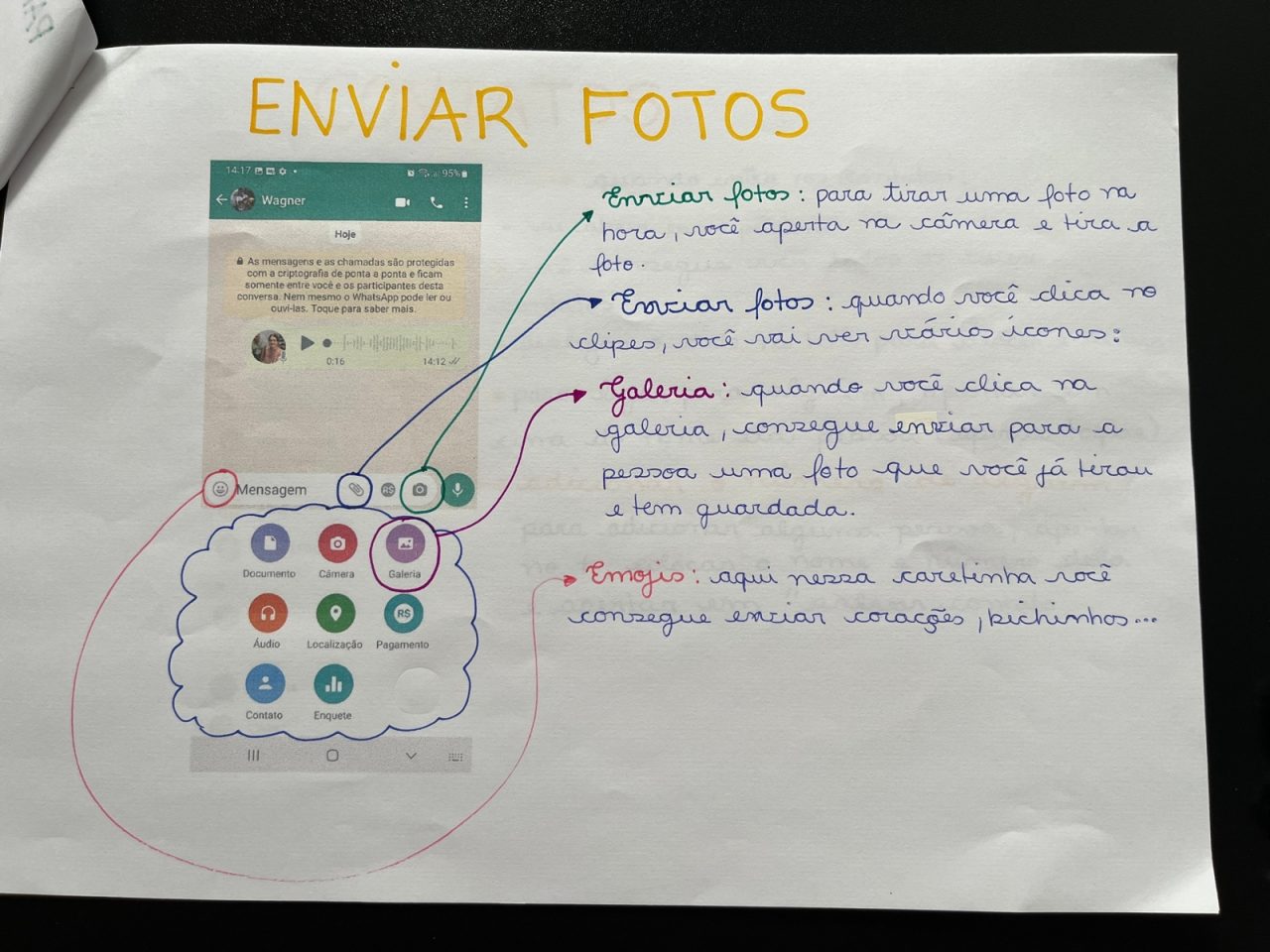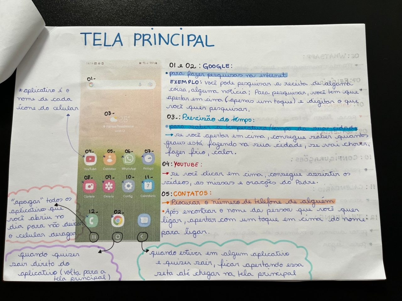 “Eu fiz um manual para ela, tirei print de todas as telas do celular que ela iria usar e detalhei tudo, coloquei a função de cada ícone. Foquei bastante no WhatsApp também, explicando cada coisinha que tinha e que ela poderia utilizar. No começo eu percebi q ela estava um pouquinho perdida ainda, mesmo com o manual, eu mandava mensagem para ela, ela nem visualizava, mas agora ela já consegue visualizar e até me responder em áudio, muito fofa!!”