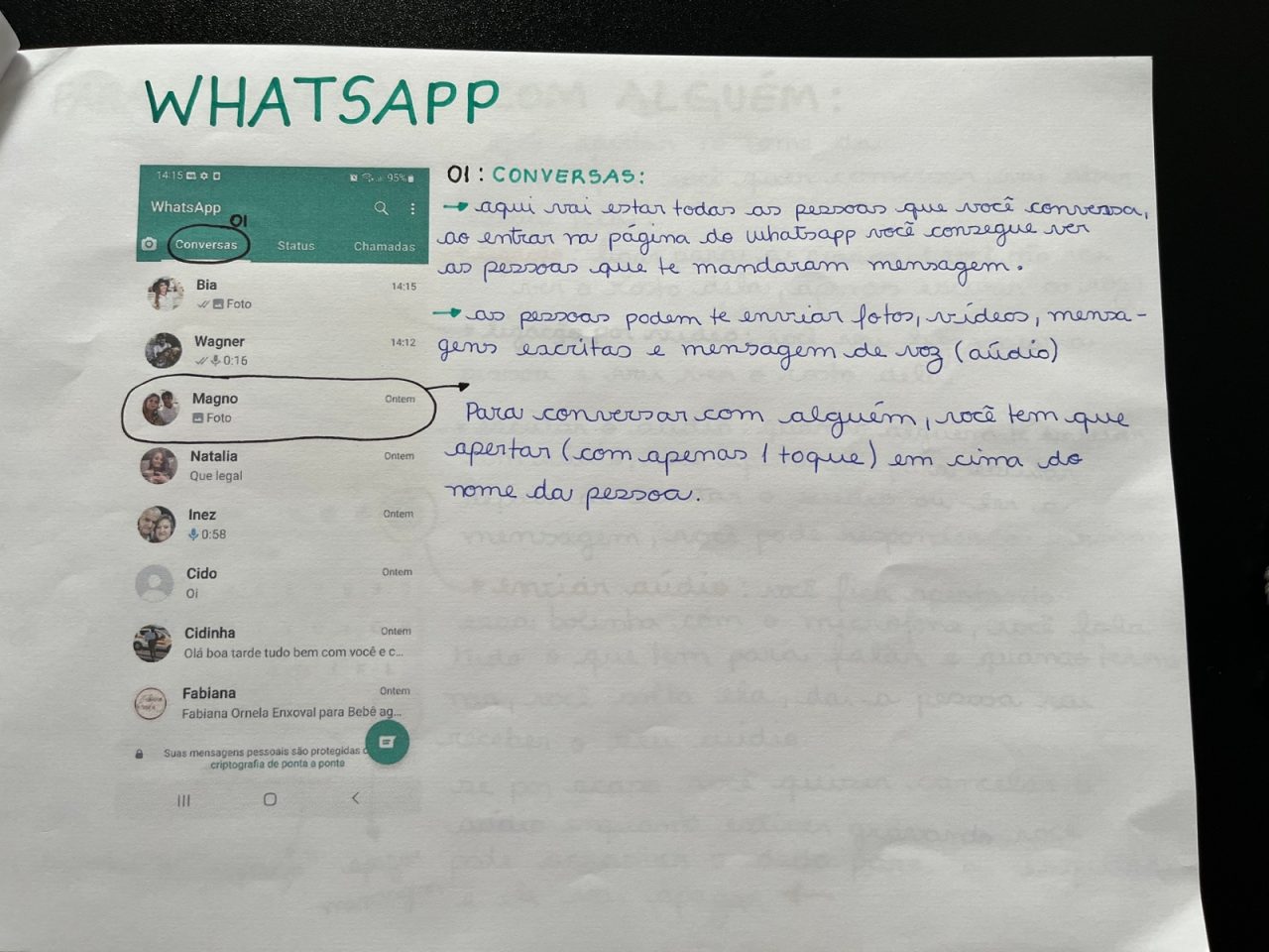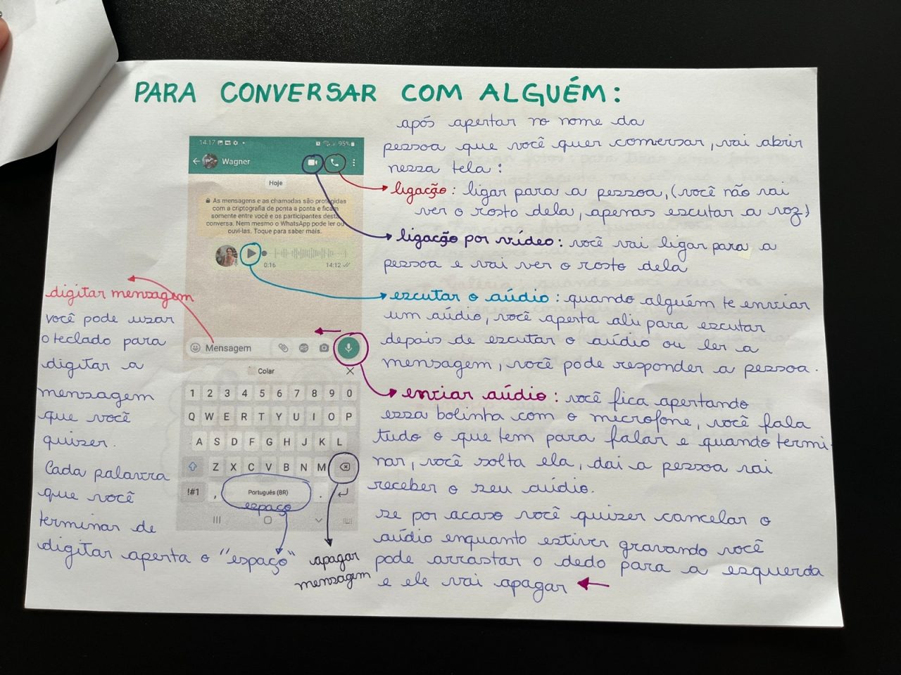 Beatriz fez três tentativas para ensinar Maria a lidar com a nova tecnologia, mas sem muito sucesso. “Por ser algo muito novo para ela, tecnologia e tudo mais, ela não tinha noção nem de como começar, não sabia para que serviam os ícones do celular, WhatsApp… ela não sabia que dava para se comunicar com as pessoas através de vídeo chamada, fotos, áudio e tudo mais. Ela ficou impressionada quando comecei a mostrar todos esses recursos do celular. Expliquei várias vezes como os aplicativos e ícones do celular funcionavam, mas por ser uma pessoa mais simples, humilde, idosa e que nunca teve contato com a tecnologia, ela não entendeu muito bem, então para ela não desanimar e desistir do celular eu decidi fazer esse manual mais interativo e simples para ela conseguir acompanhar”, relata.