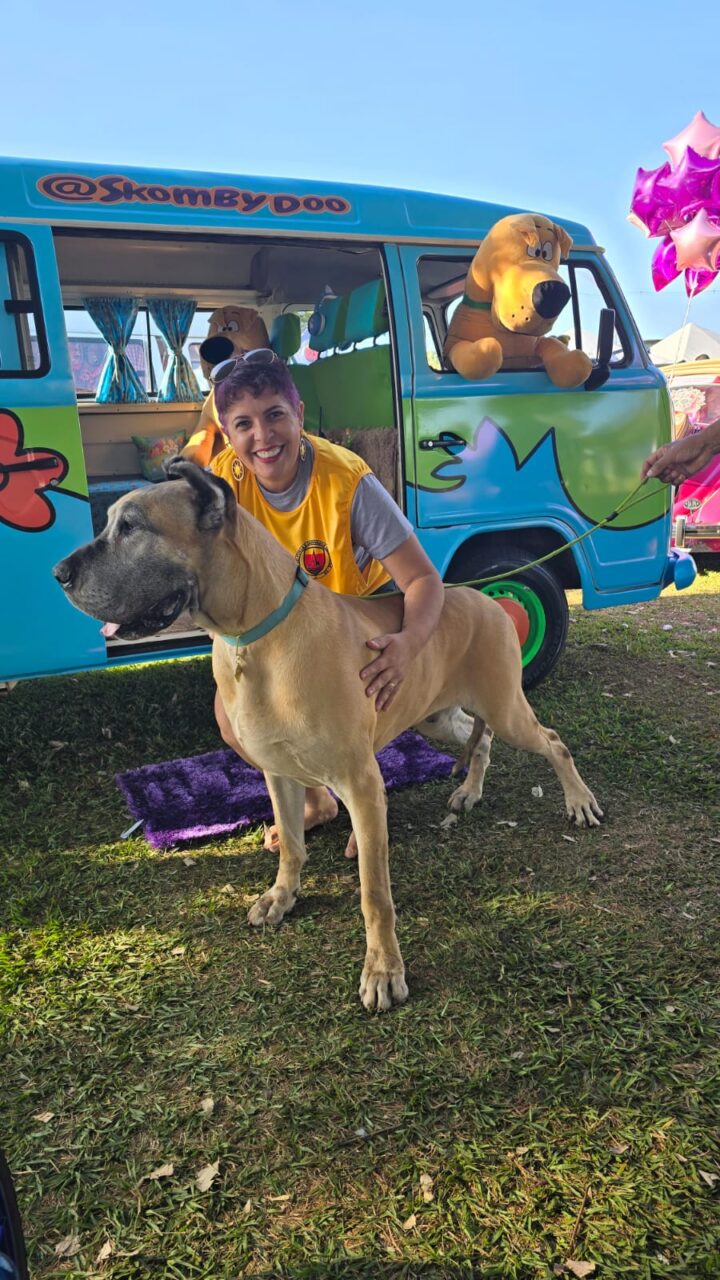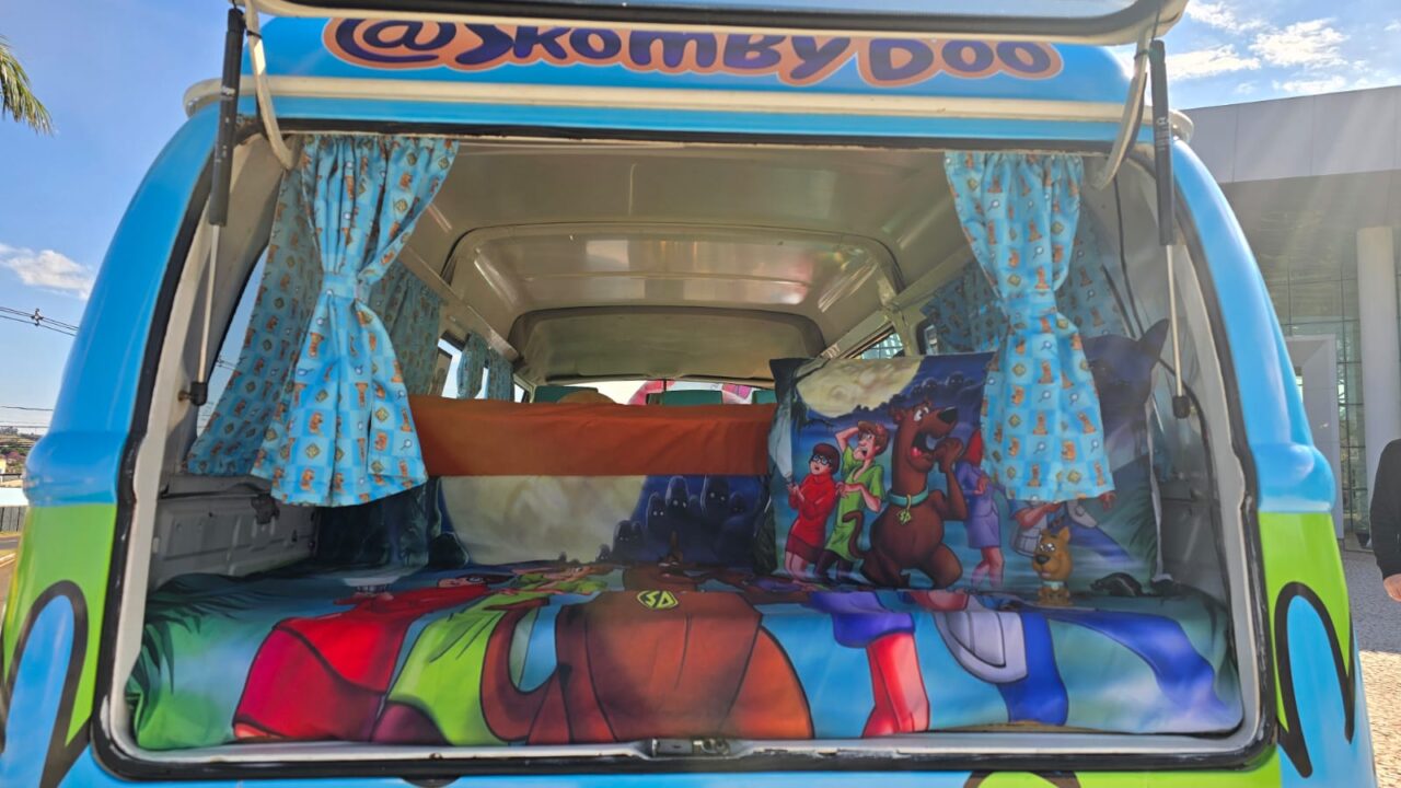A Kombi que foi transformada em “SkombyDoo”, inspirada na Máquina de Mistério, foi comprada no dia primeiro de maio, já com a intenção de deixar o veículo com a cara daquele do desenho clássico. Foi preciso reformar a lataria e fazer reparos mecânicos antes da adesivagem do veículo. Mas a decoração inclui a parte interna. “Um amigo nosso foi para um dos maiores eventos de carros antigos, que acontece em Águas de Lindóia (SP), e trouxe alguns personagens de um mercado de pulgas, de coisas antigas, que coloquei em uma mesinha”, conta Paula.