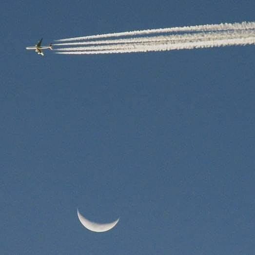 A fotógrafa Suely Sanches conseguiu um registro incrível de um momento desse. Ela capturou um avião com suas quatro turbinas deixando rastros no céu. Para ficar ainda mais bonito, a lua compõe a foto.