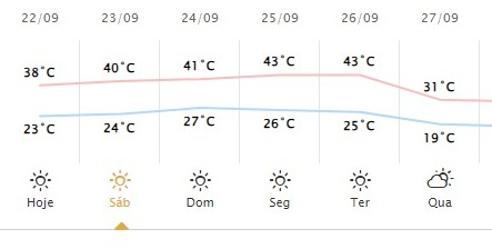 No entanto, neste sábado, 23, início da primavera, a temperatura poderá chegar até 40°C, já no domingo, 14, a previsão aponta máxima de 41ºC. Acha que está calor? Pois pode piorar: na segunda-feira, 25, a temperatura pode chegar a 43ºC em Maringá.