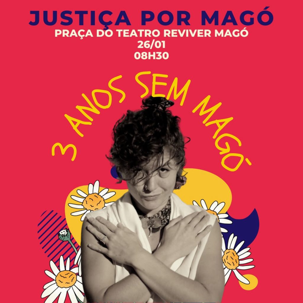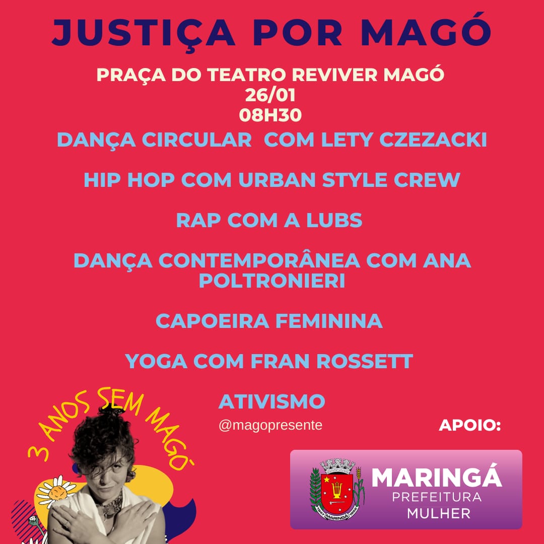 Com objetivo de marcar a luta contra o feminicídio, Maringá terá o ato “Justiça por Magó”. A ação será realizada em frente ao Teatro Reviver Magó, no dia 26 de janeiro, a partir das 8h30. Serão realizadas várias atividades e apresentações artísticas. O objetivo é lembrar da importância de políticas públicas contra o feminicídio, é o que explica a irmã da bailarina Magó, Ana Clara Poltronieri Borges.