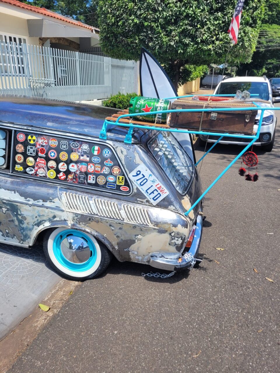 Contudo, o valor investido para transformar o carro foi significativo. “Gastamos cerca de R$ 35 mil para deixá-la do jeito que queríamos”, revela. Esse valor inclui, entre outras modificações, o bagageiro estendido, que carrega itens como prancha de surf e skate, e até malas e baús temáticos de inspiração americana. Além disso, para completar, o carro recebeu toques sonoros e visuais com sirenes, giroflex e outros detalhes excêntricos que complementam seu visual retrô e ousado.