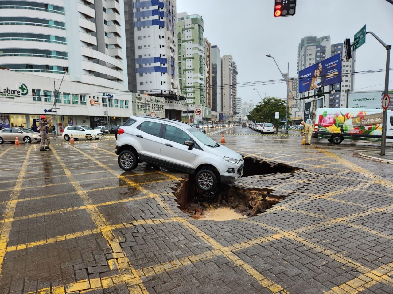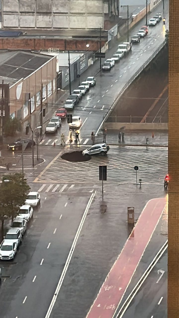 O fato foi registrado antes das 9h da manhã. No local, já havia um desnível no asfalto, que se aprofundou na manhã chuvosa desta terça.