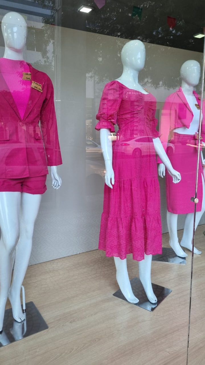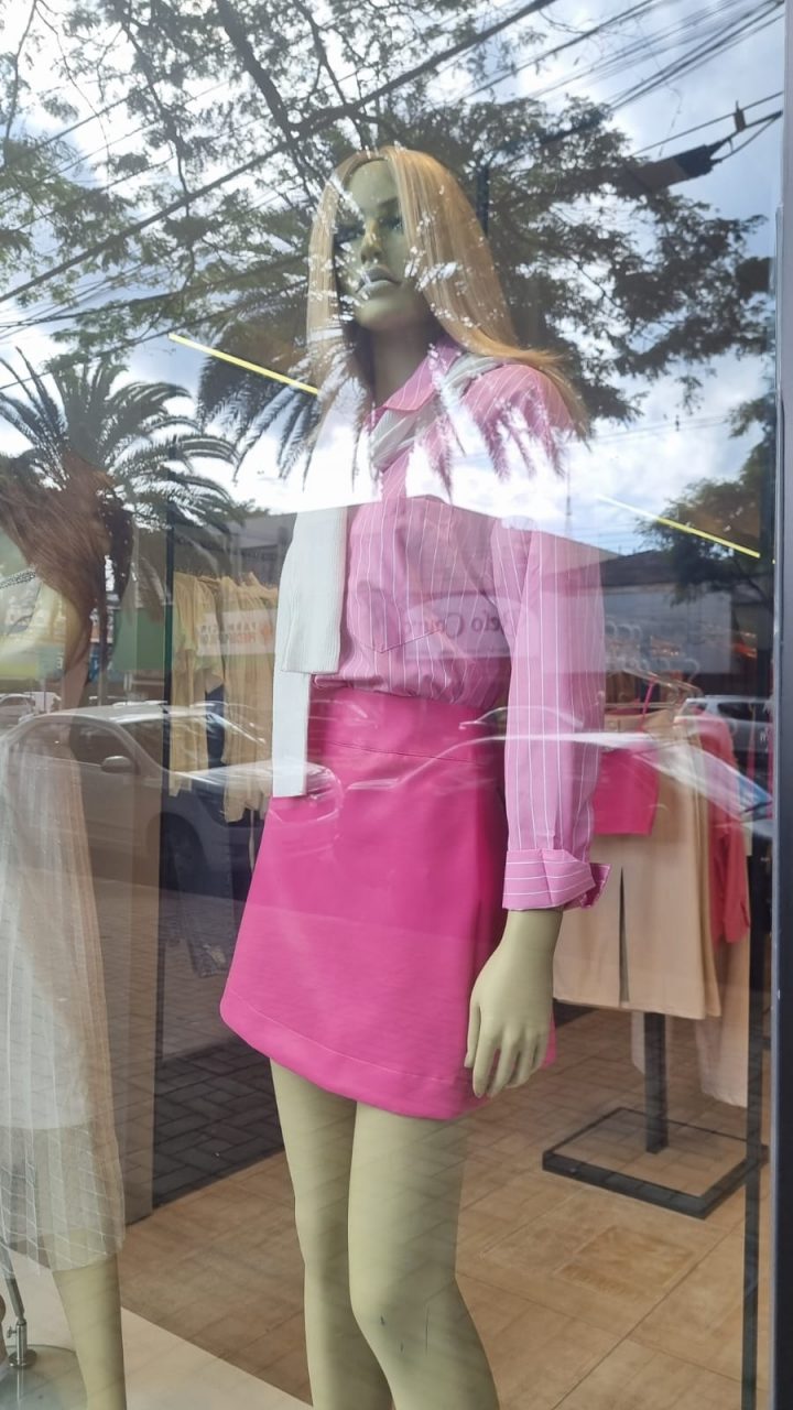 A diversidade de produtos cor-de-rosa nas vitrines impressiona. As roupas vêm em todos os tamanhos, infantil e adulto, masculino e feminino… E na decoração, há desde os tradicionais balões até réplicas da caixa da boneca em formato gigante. Não há limites para o “fenômeno pink” que tomou conta do comércio impulsionado pela estreia do filme “Barbie”. Maria Inês da Silva é gerente em uma loja de roupas na Avenida São Paulo, no centro de Maringá. É vestindo um blazer cor de rosa que ela fala, otimista, sobre as vendas dos produtos inspirados no chamado “barbiecore”, uma estética que tem a cor rosa – marca registrada da boneca – como um dos seus principais elementos.