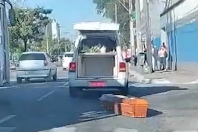 Através das imagens, é possível notar que o condutor parou o veículo assim que percebe que o caixão ficou para trás. Sozinho, ele tenta colocá-lo novamente no carro, mas não obtém sucesso.