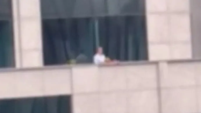 Nas imagens que estão sendo compartilhadas por diversos perfis nas redes sociais, é possível ver um homem vestido com roupas sociais e uma mulher de camisa amarela. Aparentemente sem se importar com o quão visível era o local, o casal tem relações íntimas no terraço.