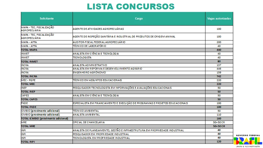 As 4,4 mil vagas estão distribuídas entre os Ministérios da Agricultura, Pecuária e Abastecimento (MAPA), do Desenvolvimento, Indústria, Comércio e Serviços (MDIC), da Educação (MEC), do Meio Ambiente (MMA), das Relações Exteriores (MRE), da Saúde, de Minas e Energia (MME) e da Ciência, Tecnologia e Inovação (MCTI).