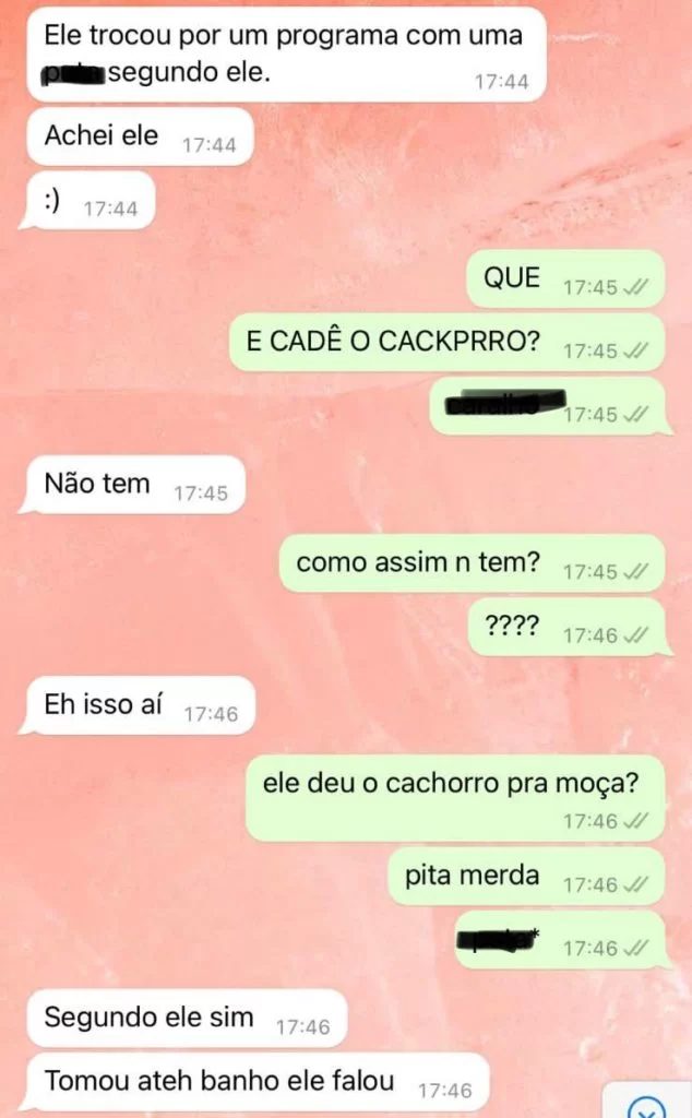 “Quando o encontrei, perguntei se era ele mesmo que mais cedo estava com o cachorro. Ele respondeu: ‘Sim, mas já troquei por um programa com uma p*ta. Até ganhei um banho’”, relata Arthur Oliveira, amigo da possível nova tutora do pet, ao Metrópoles. O mendigo ainda confirmou a troca do cão por sexo com outros dois moradores, a fim de convencer Arthur.