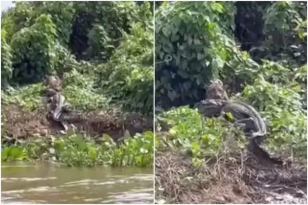 Nas imagens que circulam nas redes sociais é possível ver a onça-pintada segurando firmemente o jacaré pelo pescoço. Inclusive, o enorme réptil não esboça reação alguma.