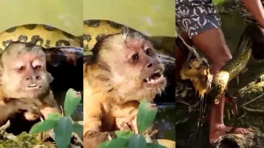 No registro, o macaco pede “ajuda” enquanto é abraçado pela serpente. A fim de escapar da morte, o primata tenta se agarrar a algo às margens do Rio Formoso, mas acaba sendo comprimido cada vez mais pela cobra.
