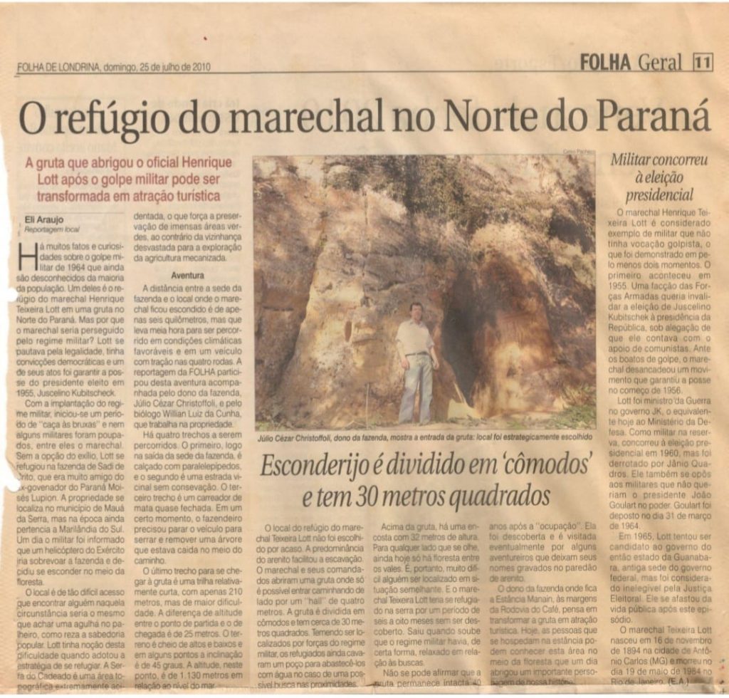 Marechal Lott foi um Ministro de Guerra que teve um papel importante durante a posse de Juscelino Kubitschek e João Goulart. A história que se contava era que durante o golpe militar de 1964Lott passou a ser perseguido pelo regime e se abrigado na Fazenda Monte Sinai, que pertencia a um amigo do governador do Paraná na época, o Lupion. Quando soube que o exército iria sobrevoar a região, o Marechal e os soldados que o acompanhavam decidiram fugir para a mata, onde teriam feito as escavações na caverna para se esconder.