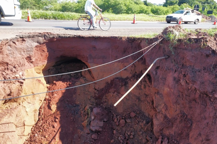 O impacto inicial da cratera já havia consumido mais da metade da faixa do lado esquerdo para quem trafega no sentido de Umuarama a Cruzeiro do Oeste.