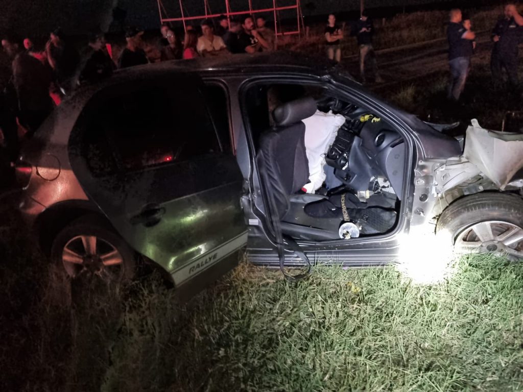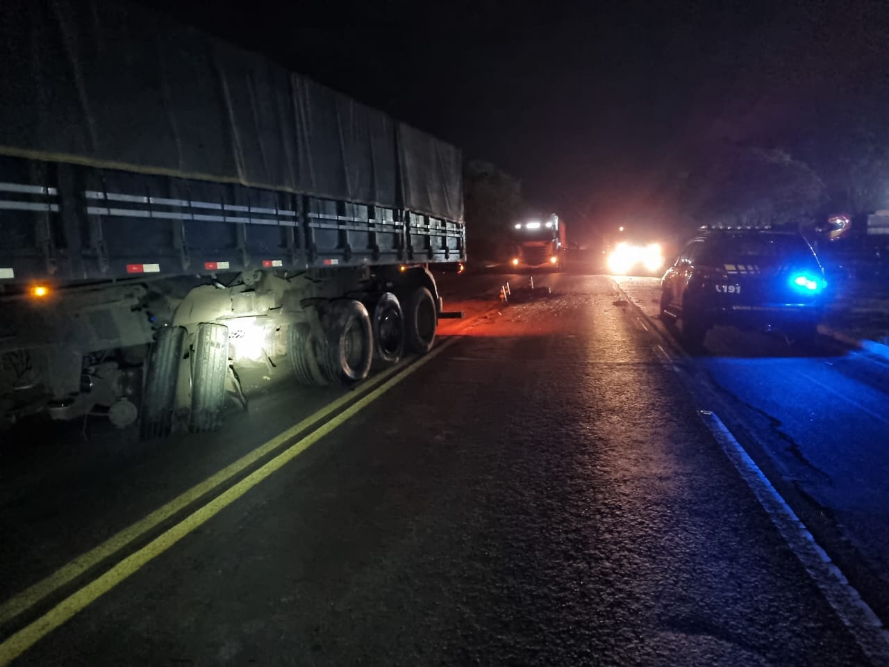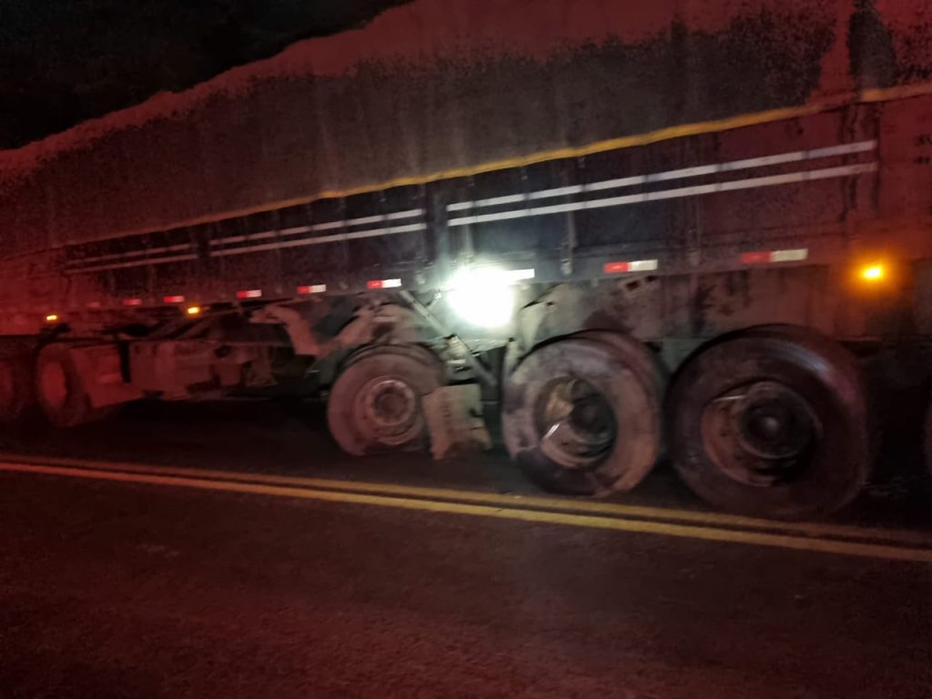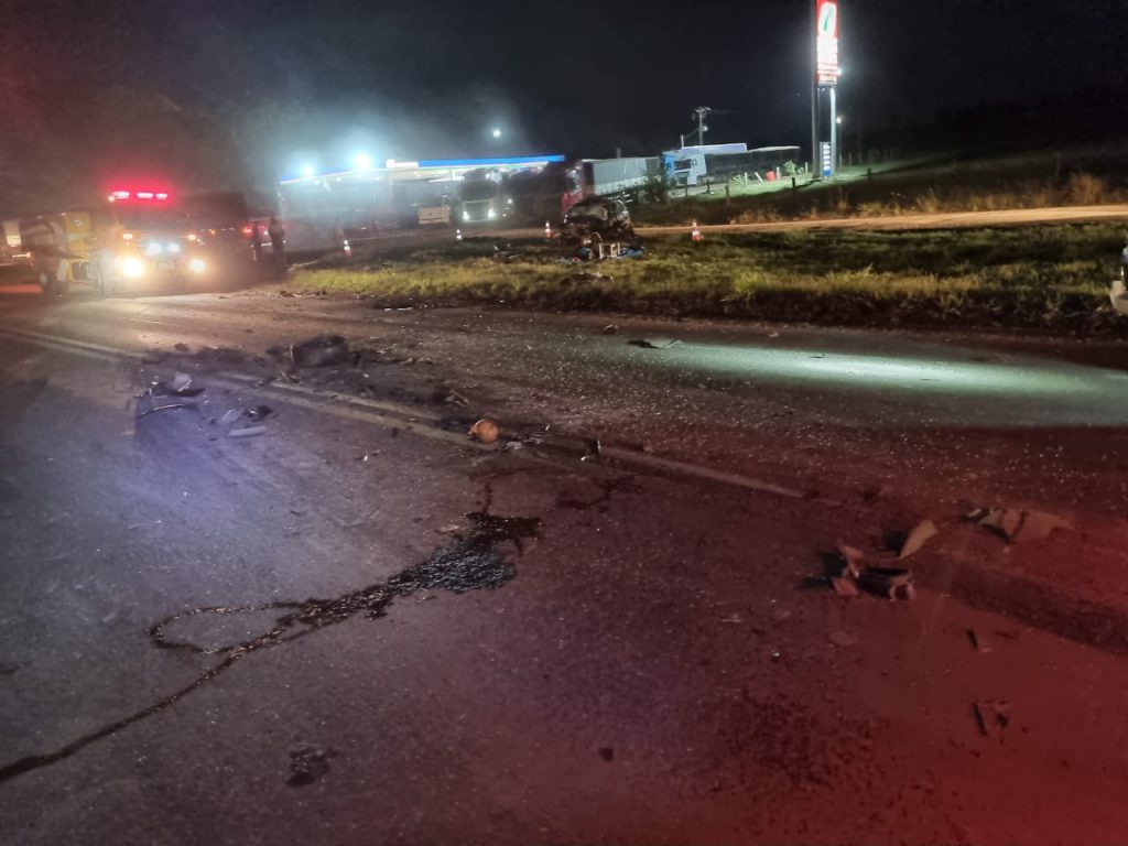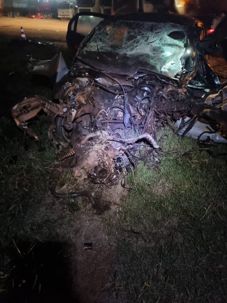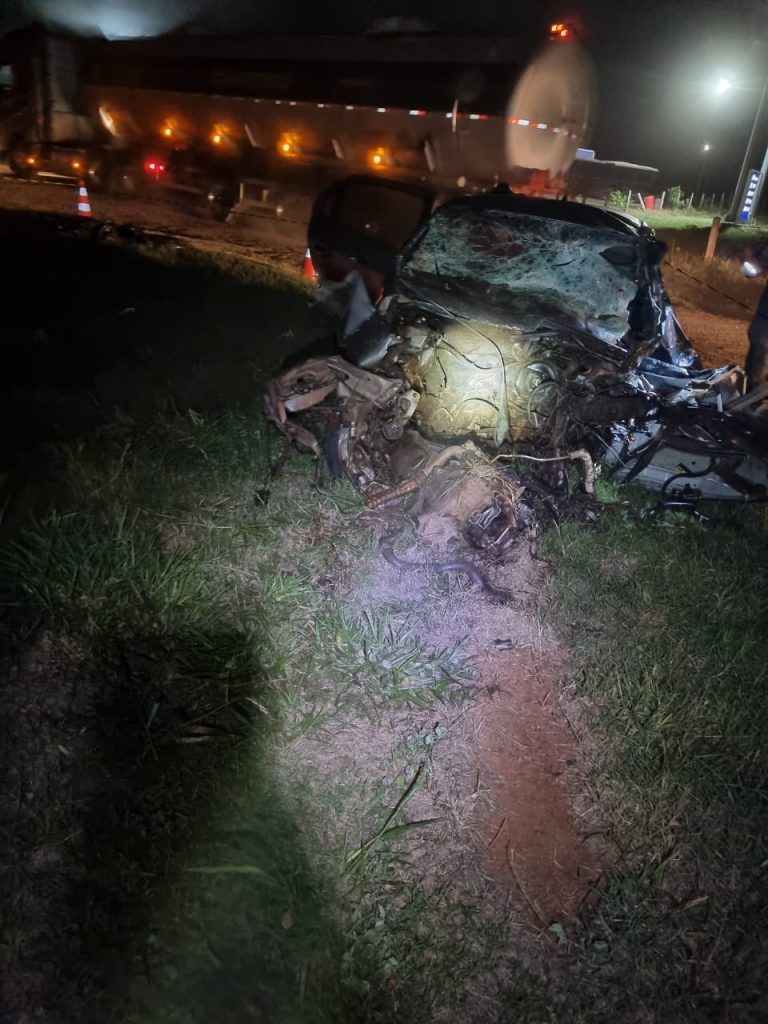 Segundo o Corpo de Bombeiros, um caminhão saia de um posto de combustíveis quando foi atingido no rodado da carreta por um carro, que seguia no sentido Loanda. O carro ficou destruído.
