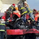 Com o impacto, o motor do carro se desprendeu do veículo, sendo lançado a metros de distância, e a porta do carro ficou presa na parte da frente do caminhão.