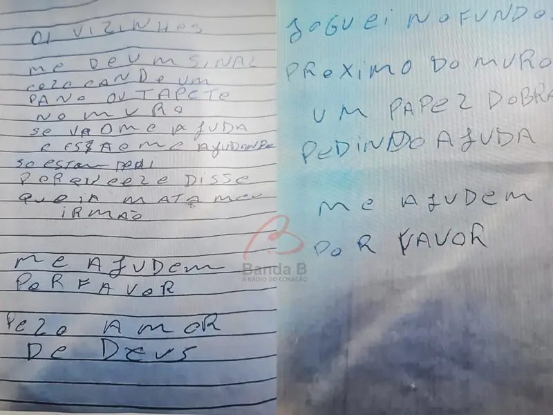 Em outro comunicado, a vítima afirma ter jogado outro bilhete aos moradores da casa ao lado: “Joguei nos fundos, próximo do muro, um papel dobrado pedindo ajuda. Me ajudem, por favor”.