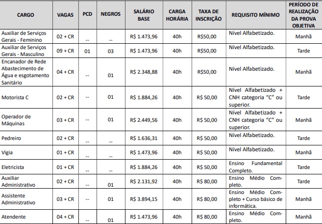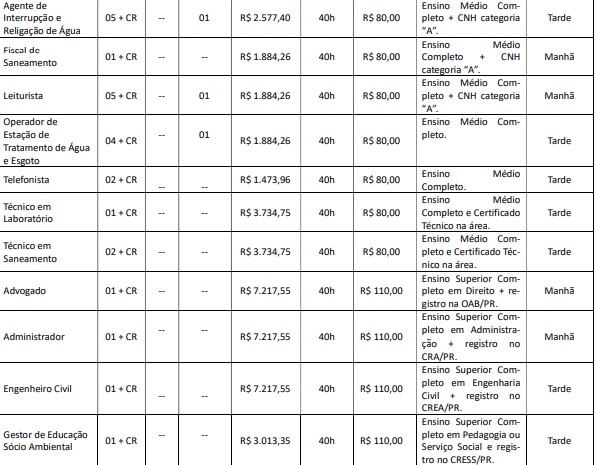 O Serviço Municipal de Saneamento Ambiental – Água de Sarandi, abriu nesta segunda-feira, 10, inscrições para concurso público para contratação imediata e formação de cadastro de reserva. Há vagas disponíveis para 22 cargos e os salários variam entre R$ 1.473,96 e R$ R$ 7.217,55 – veja abaixo a lista completa de cargos, número de vagas, salários, carga horária, valores de taxas de inscrição e requsitos exigidos para cada cargo.