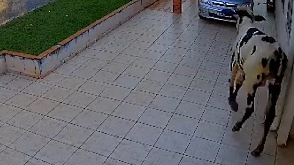 Um boi invadiu uma residência e a ação foi registrada por câmeras de segurança.