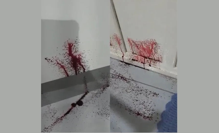 Conforme as imagens feitas pelos moradores, o líquido, que se assemelha a sangue, escorre de paredes, portas e outros móveis. Para investigação, um exame foi realizado em um laboratório particular e comprovou que o material é sangue do tipo O positivo. Veja: