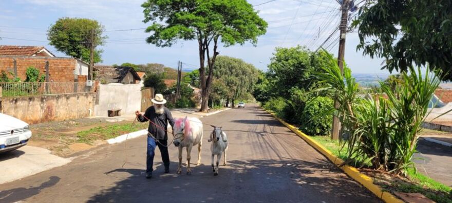 Quando pensamos em animais de estimação é comum vir à mente gatos, cachorros e até mesmo os peixes. Pois é, em Apucarana, no norte do Paraná, um morador da cidade prefere ter ao lado dele um bode, carinhosamente chamado de ‘Neném’ e uma égua branca da crina rosa, a ‘Joia’.  As informações são do TN Online.