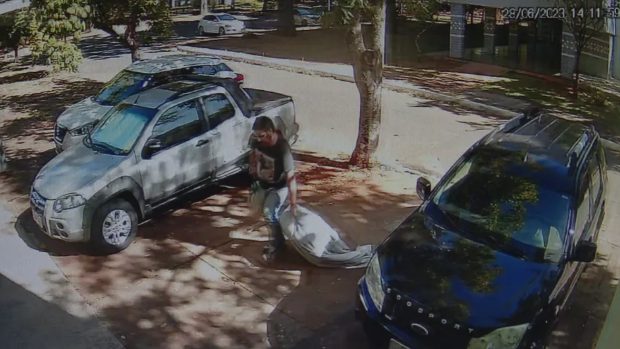 Pelas imagens, é possível ver quando Daniel chega, estaciona o carro na frente do prédio onde mora, na 411 Norte, e tira a mala do bagageiro. Em seguida, ele coloca um tipo de pano sobre o objeto e começa a arrastá-lo.