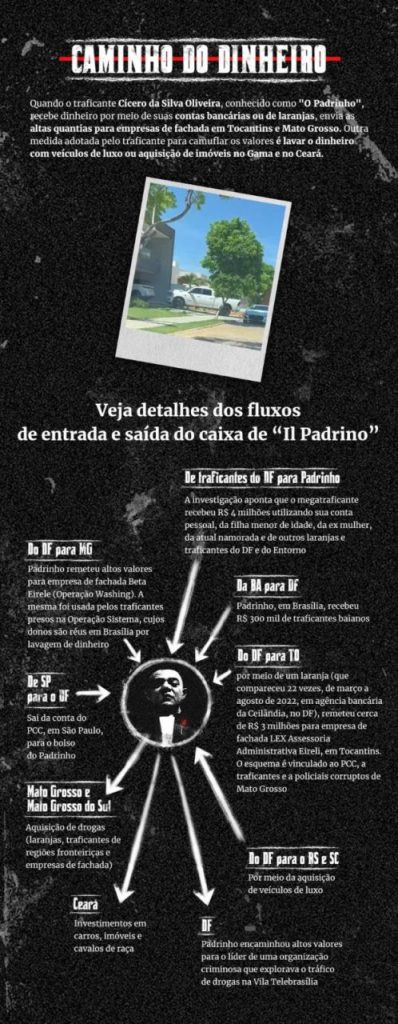 O casarão está em nome da namorada do traficante, que participou do esquema de lavagem de dinheiro, recebendo e distribuindo dinheiro de outros criminosos. “Trata-se de manobra clássica com o objetivo de ocultar a verdadeira propriedade do bem, adquirido com a atividade relacionada ao narcotráfico”, explicou um dos investigadores. Padrinho mente para os vizinhos afirmando ser dono de revendedoras de veículos ou que é executivo de uma empresa especializada em apostas on-line.