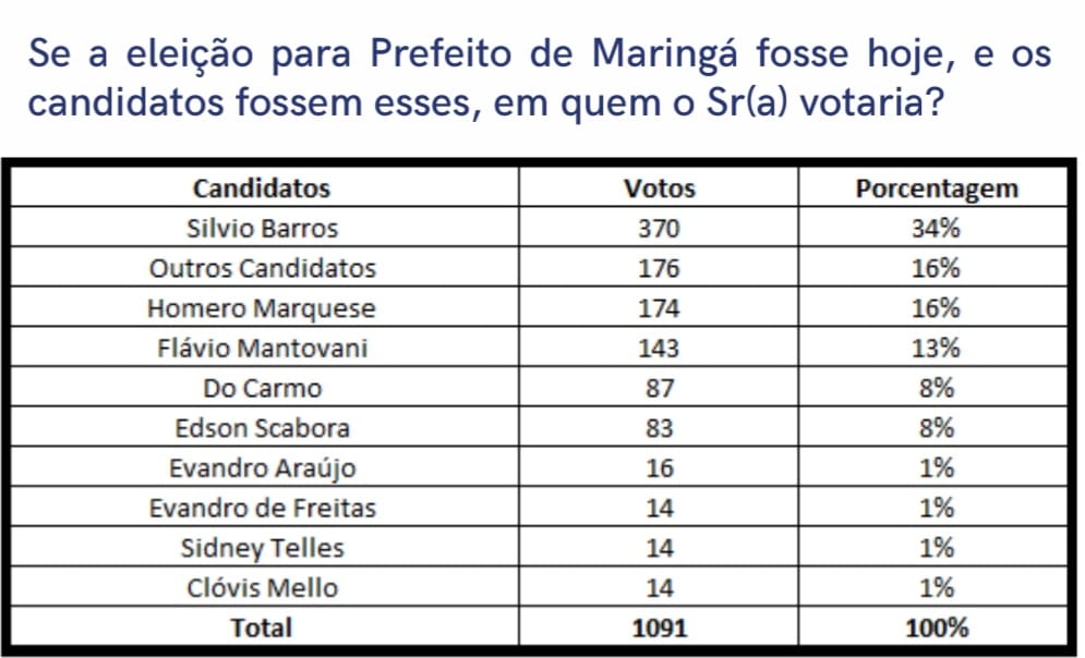 Na pesquisa, os participantes responderam à seguinte pergunta: Se a eleição para Prefeito de Maringá fosse hoje, e os candidatos fossem esses, em quem o Sr(a) votaria?