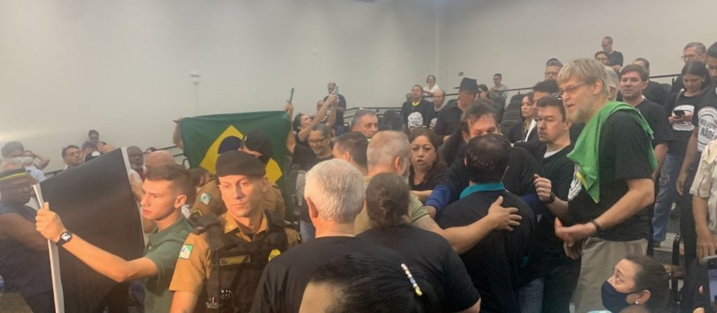 A sessão foi interrompida por causa do cenário de briga e discussão entre as pessoas no auditório. Situação de momento na Câmara Municipal. A Polícia Militar foi acionada e chegou ao plenário.